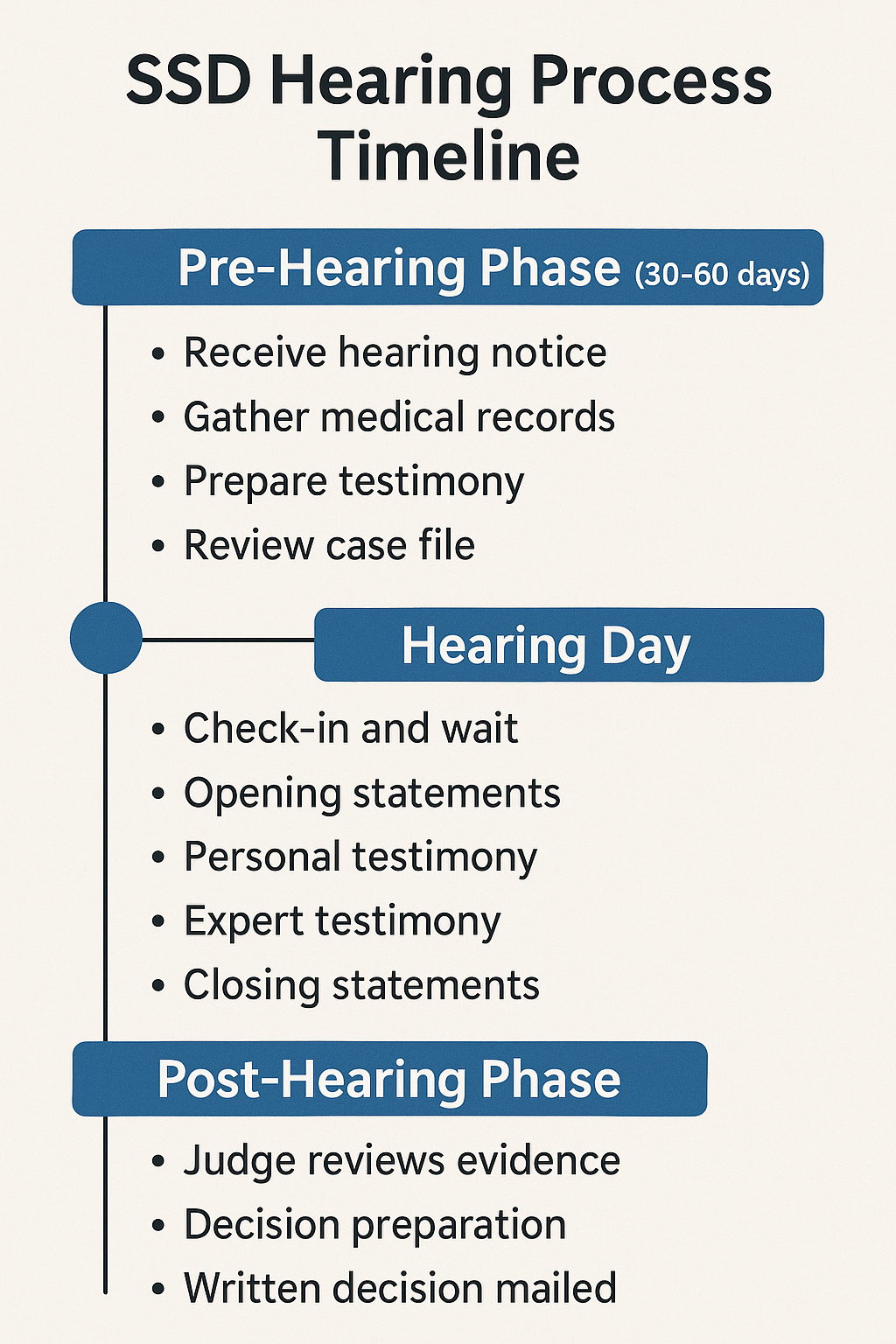 This timeline illustrates the three main phases of the SSD hearing process, showing key activities and milestones from preparation through final decision.