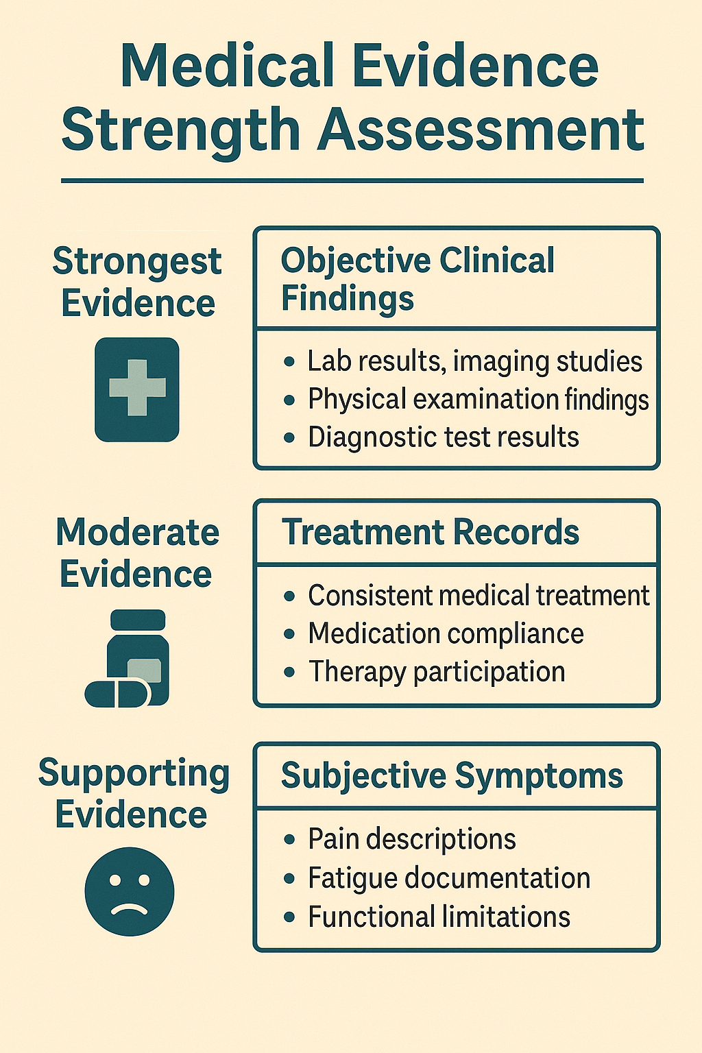 This assessment tool helps evaluate the strength of different types of medical evidence in your SSD hearing preparation.